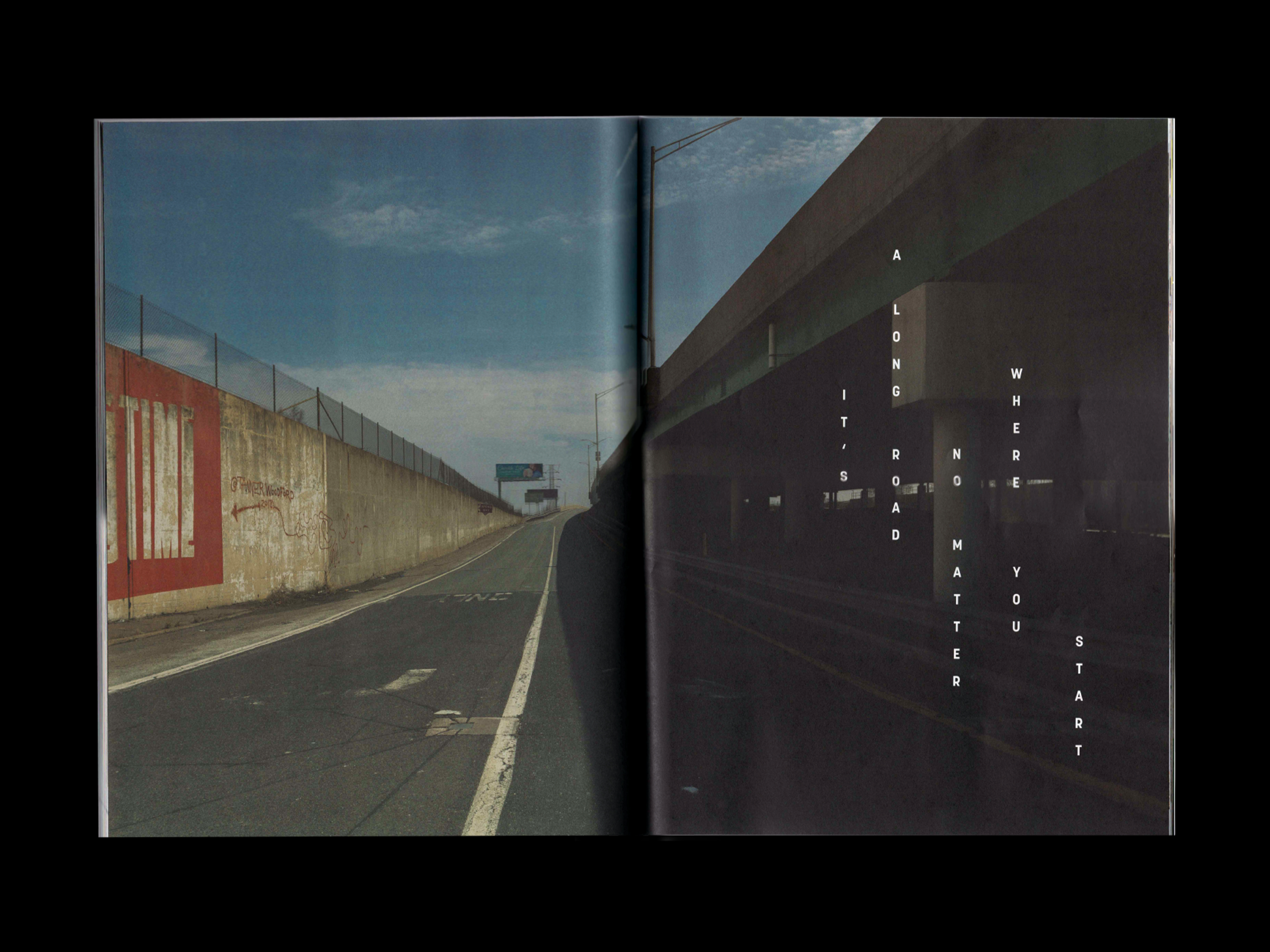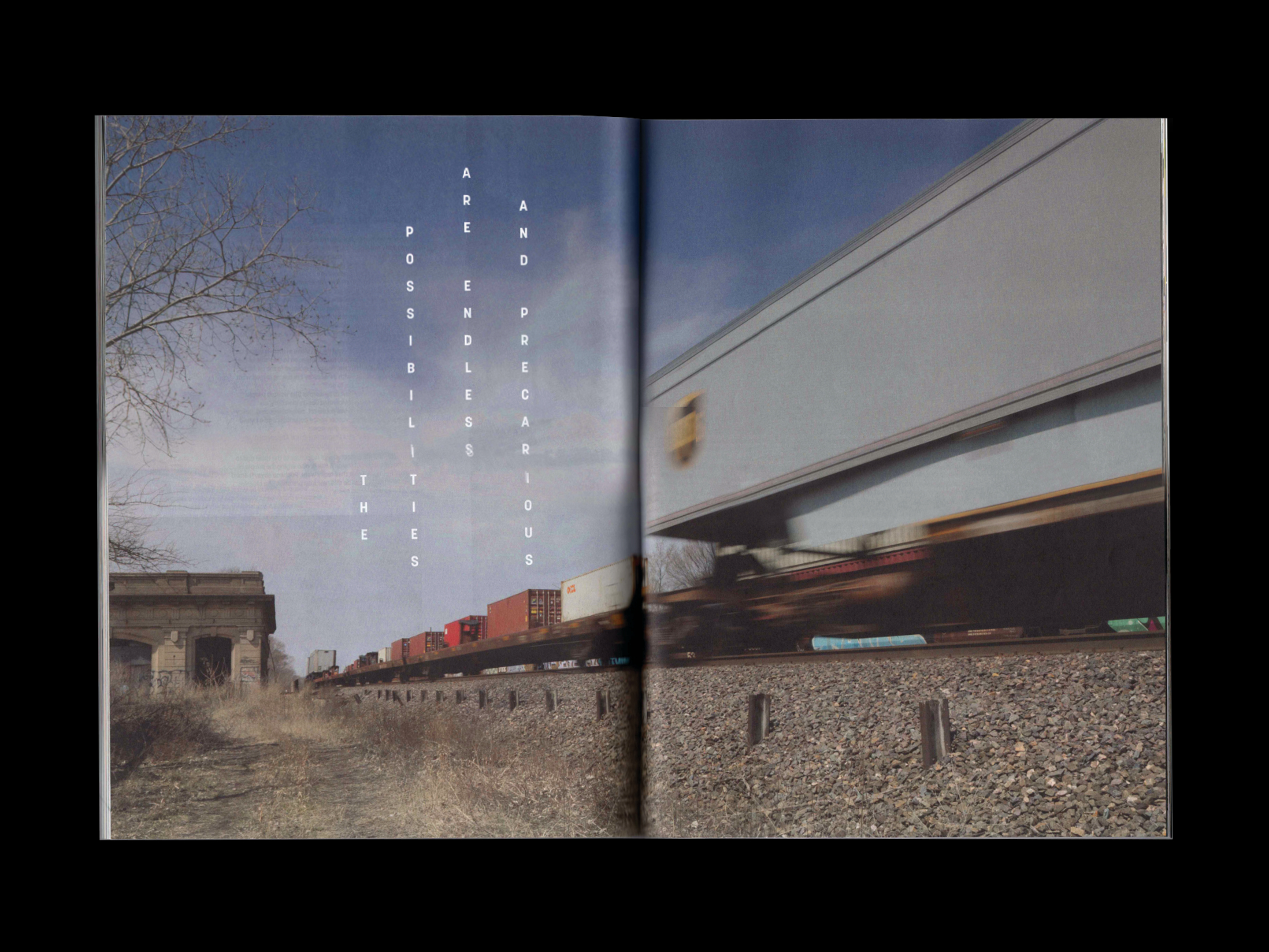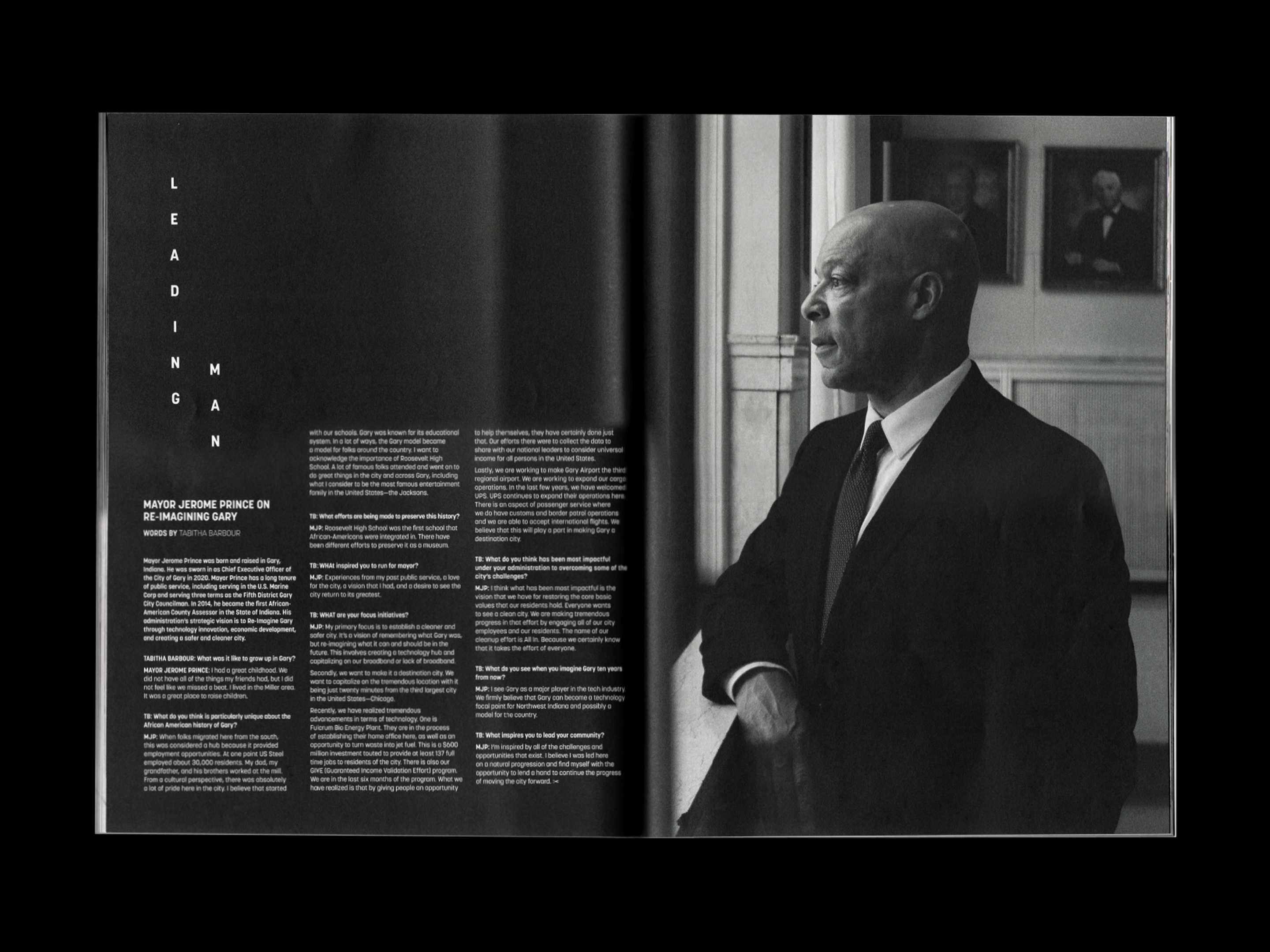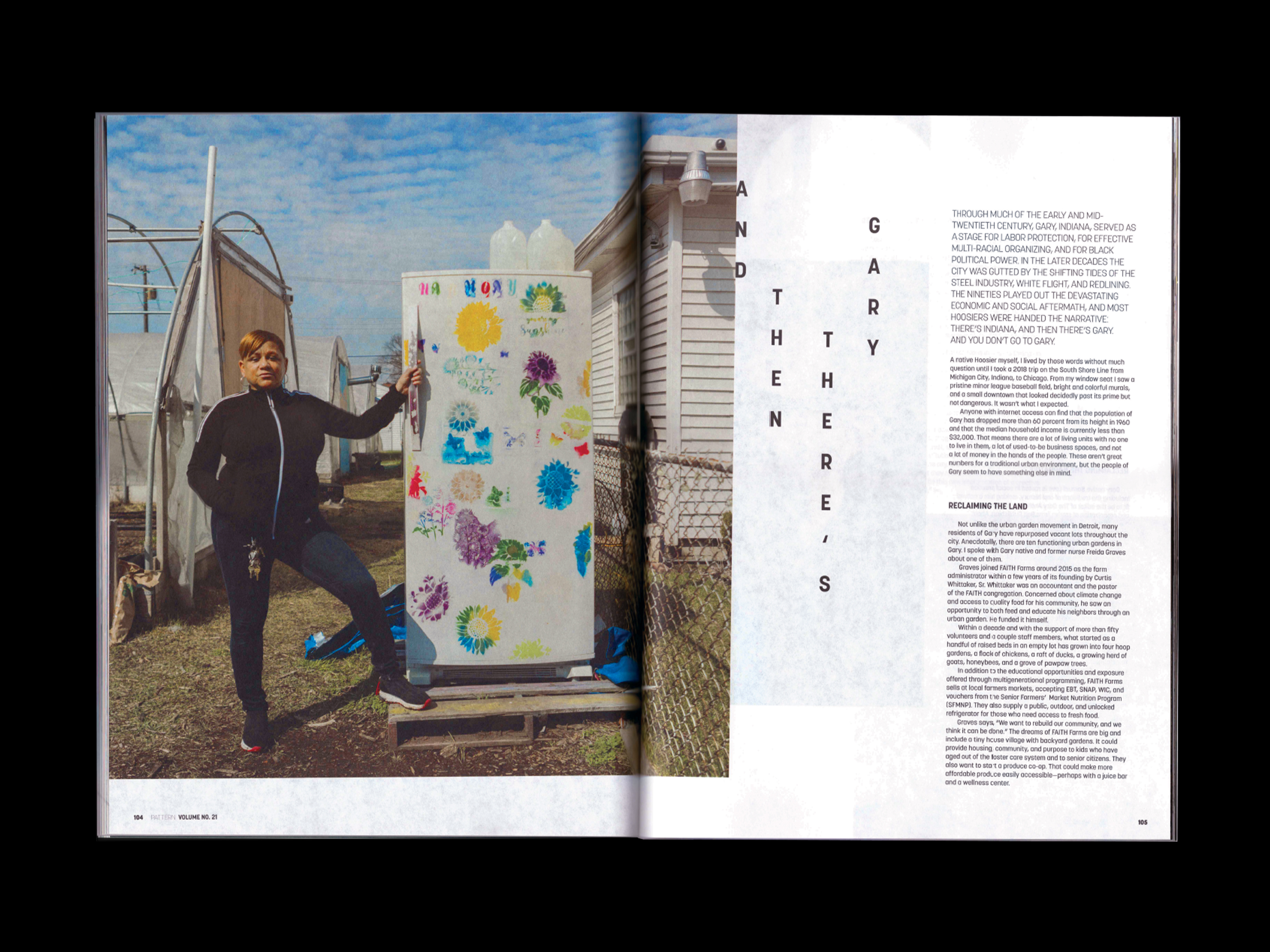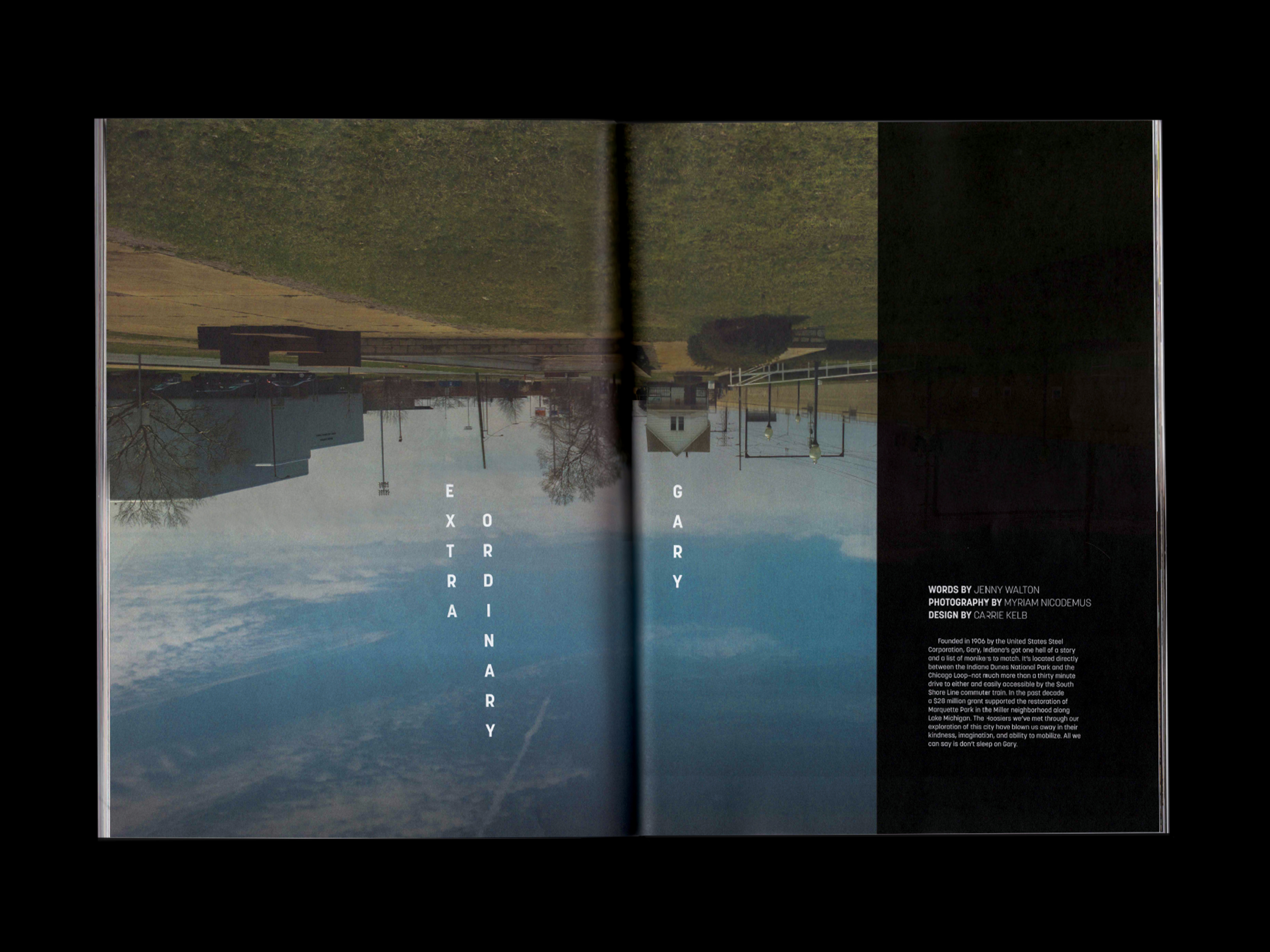 Layout design for feature highlighting the individuals and organizations revitalzing and reclaiming Gary, Indiana. Just as the feature’s stories and landscape photogaphy provide new perspectives on the city, unconventional vertical type upends the traditional reading experience.