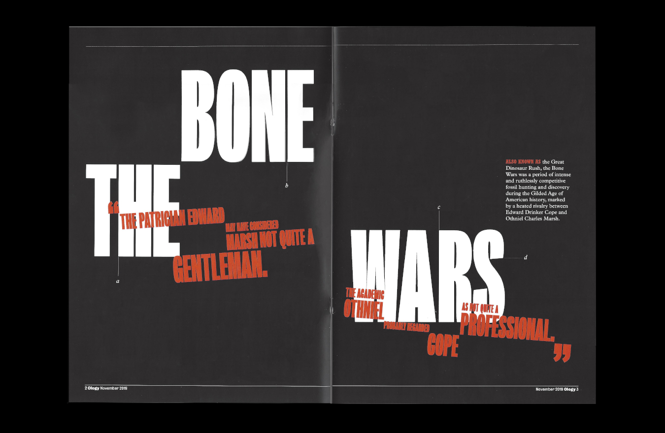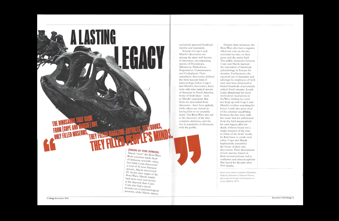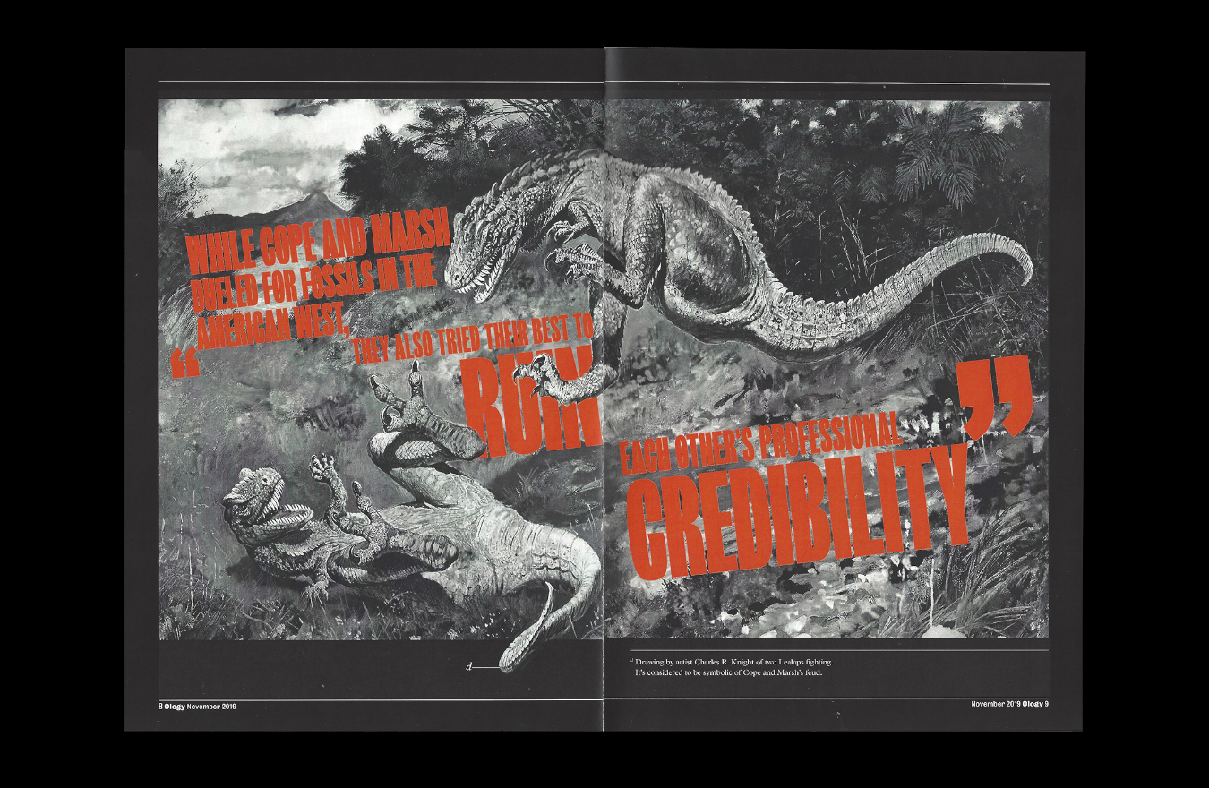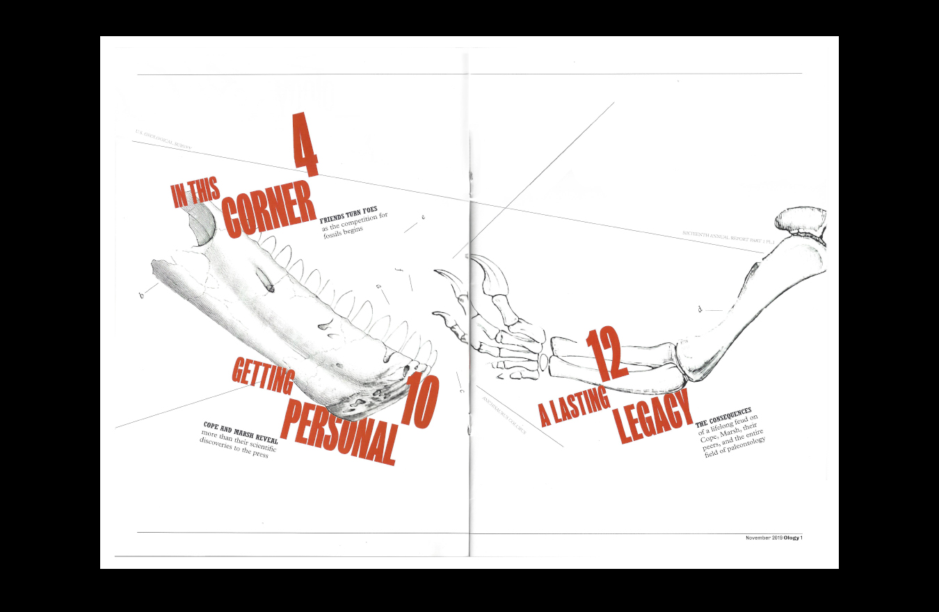 I utilized imagery from Cope’s and Marsh’s past scientific journals and writings to create illustrations that convey their quarrels visually. These elements rise, peak, and fall indramatics as the reader moves from page to page. I also took inspiration from the journals’ page borders, diagraming lines, and footnotes and reimaged them as elements for captions and folios.